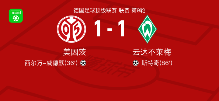 美因茨1-1云达不莱梅,西尔万-威德默打破僵局,斯特奇扳平